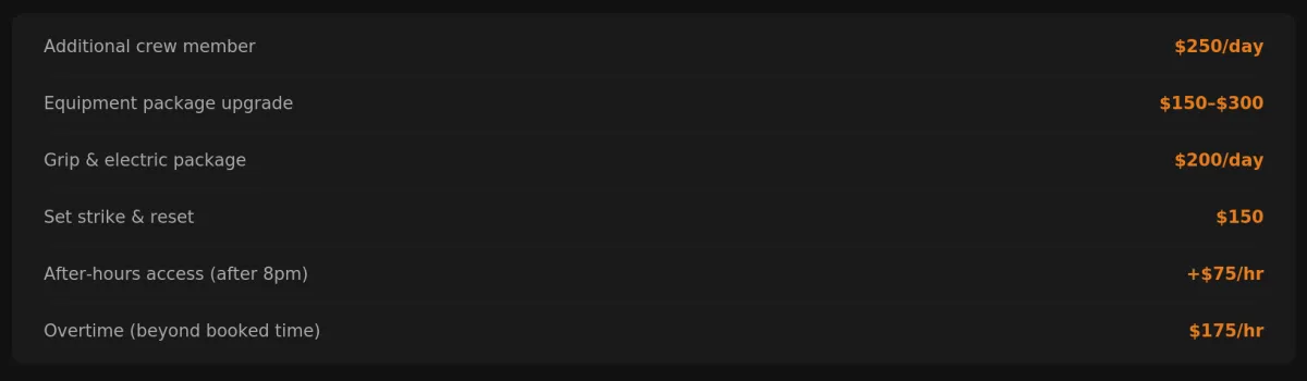 Austin's largest 3-wall cyclorama stage. Built for commercials, brand films, music videos, fashion shoots, and large-scale productions. All equipment included. No hidden fees.