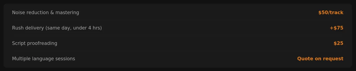 Professional voice over, commercial narration, audiobooks, e-learning, corporate video, and vocal recording. Acoustically engineered booth with broadcast-grade microphones and same-day file delivery.